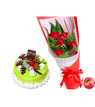 • 【6枝紅玫瑰,搭配黃鶯、巴西葉】+ 【8寸水果蛋糕】